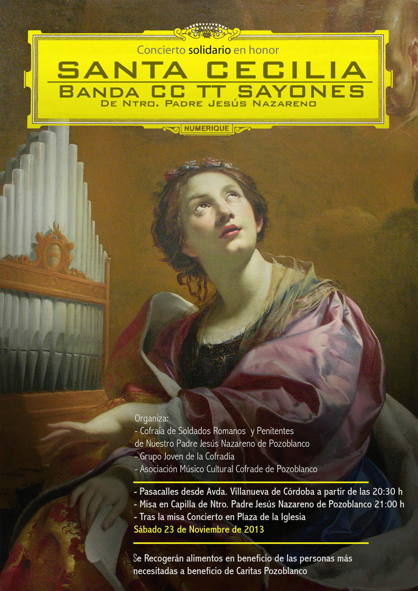 La Cofradía de Soldados Romanos y Penitentes de Ntro.Padre Jesús Nazareno de Pozoblanco, el Grupo Joven de la Cofradía y la Asociación Músico-Cultural Cofrade de Pozoblanco, organizan una serie de actos, entre los que se encuentra como colofón, un Concierto solidario en Honor a Santa Cecilia.