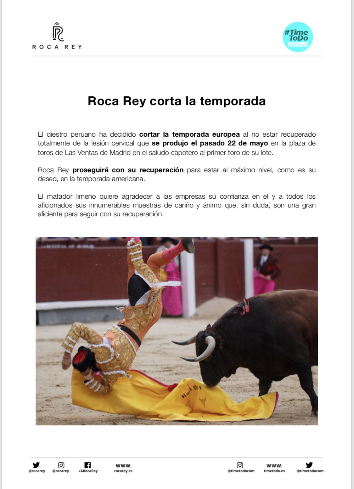 El diestro peruano Andrés Roca Rey confirmó a través de sus redes sociales, que daba por concluida la temporada 2019 a causa de la lesión de cervicales que se produjo en Madrid el pasado mes de mayo. Por este motivo, el diestro más esperado del cartel de la feria taurina pozoalbense, prevista para el próximo 21 de septiembre, ha tenido que ser sustituido por Antonio Ferrera.
